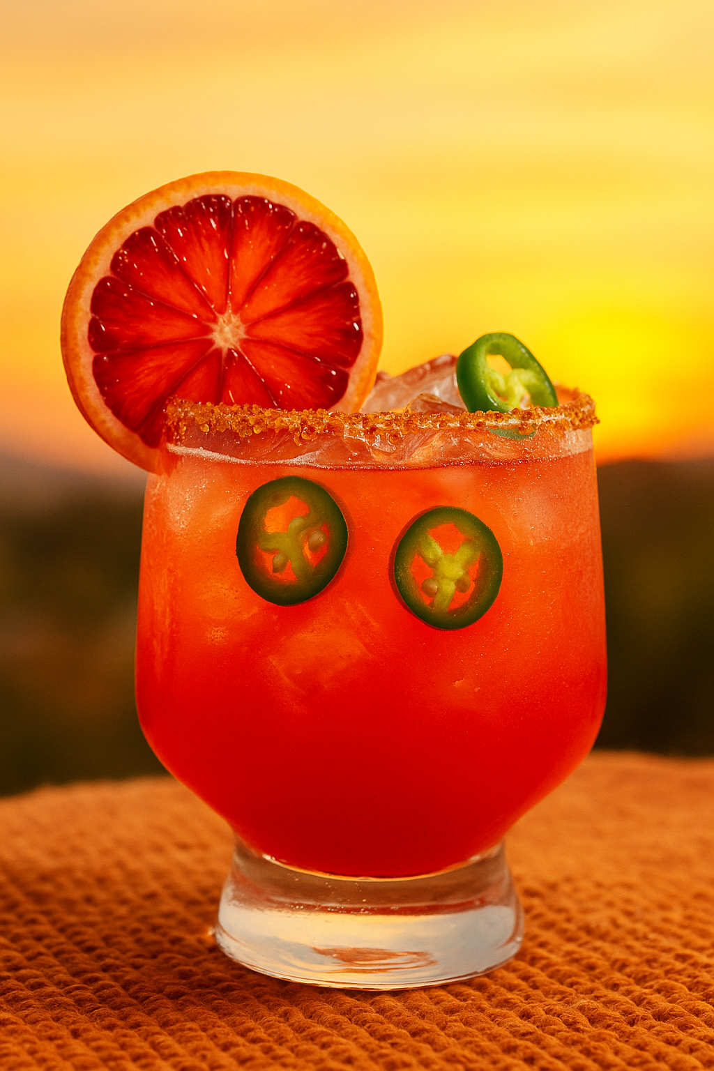 Blood orange wheel and jalapeรฑo garnish